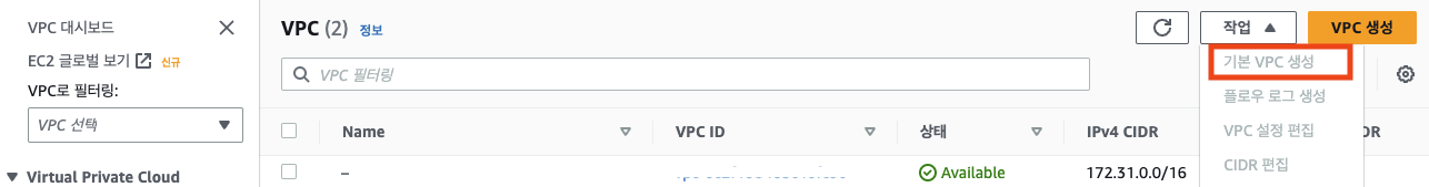 vpc 에 들어가 작업-기본vpc생성 클릭