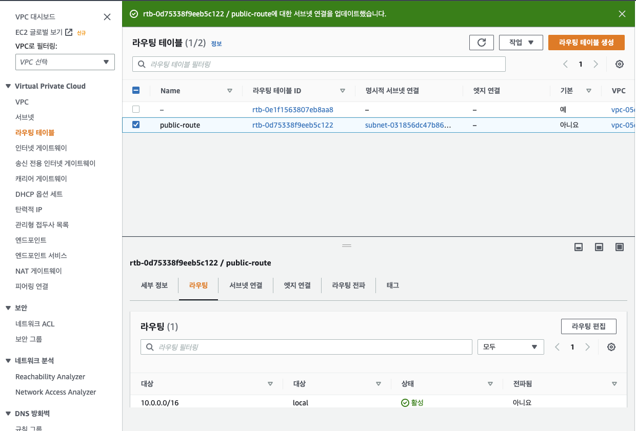 생성 후 클릭 후 서브넷 연결 클릭하여 서브넷 연결 편집 클릭