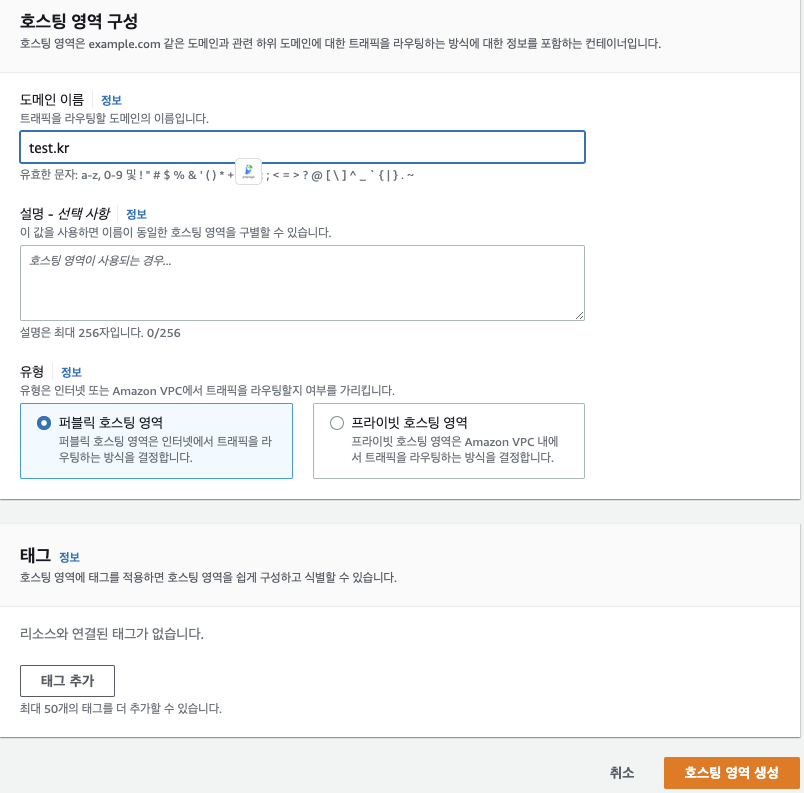 aws route 53에 들어가서 호스팅역역-호스팅 영역 생성 클릭