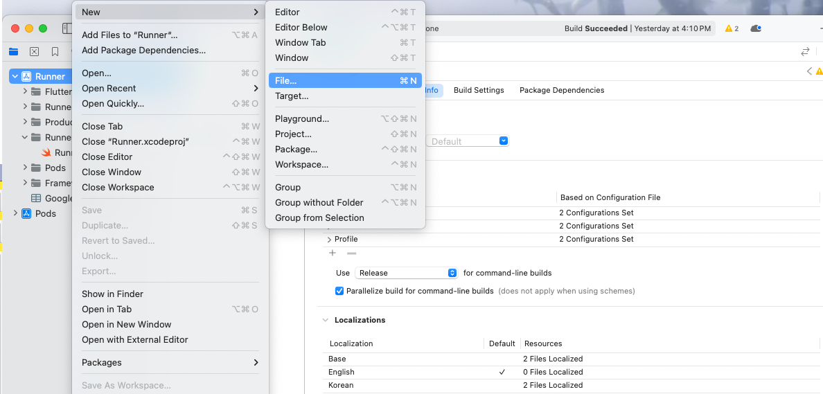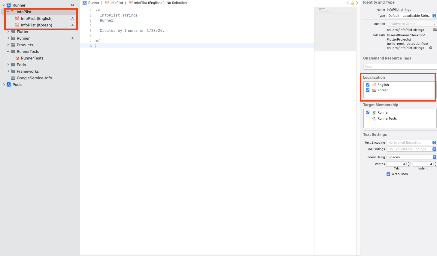 xcode 실행 후 Runner - Runner Localizations - + 클릭해서 원하는 언어들 셋팅
