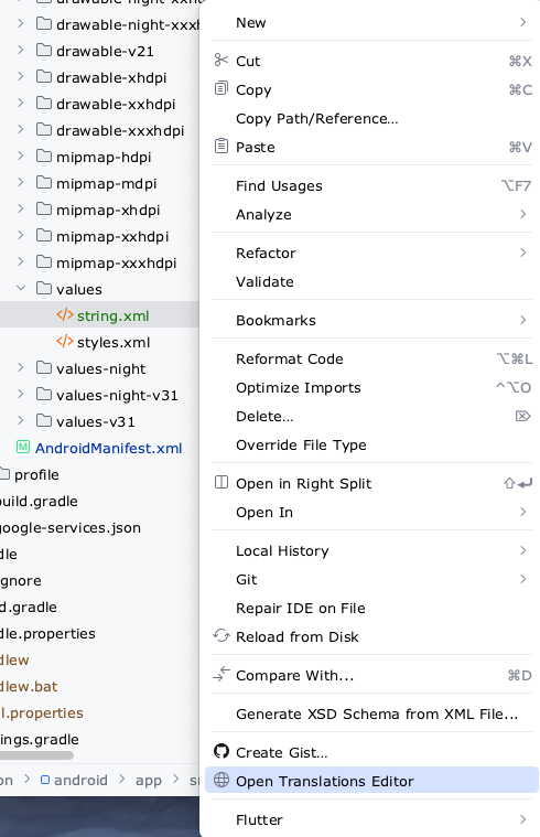values에 string.xml 생성 후 open Translations Editor 클릭
