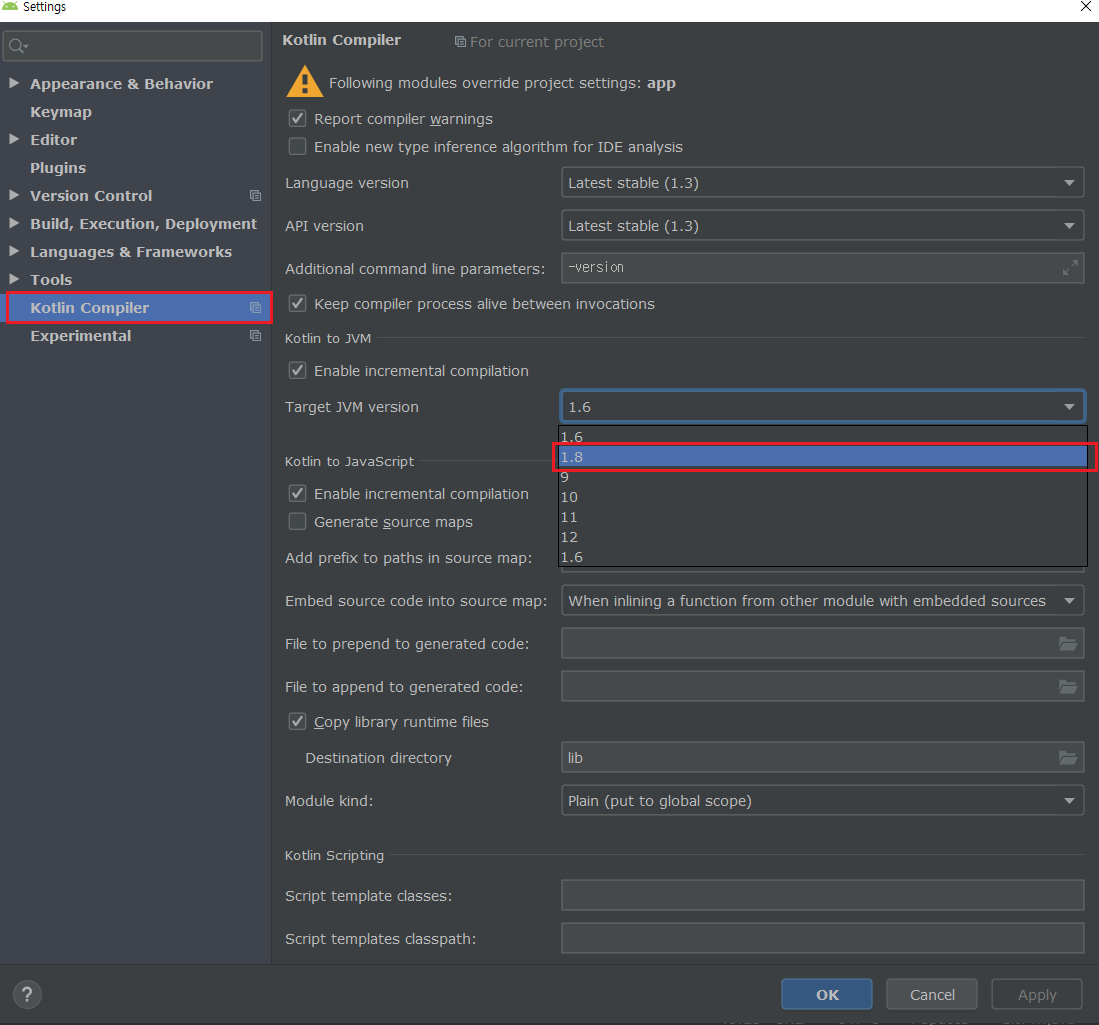 that is being built with jvm target 1.6. please specify proper '-jvm-target' option 에러가 뜬다면!!