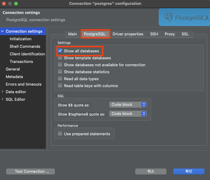 Connection settings -> PostgreSQL -> Show all databases 클릭