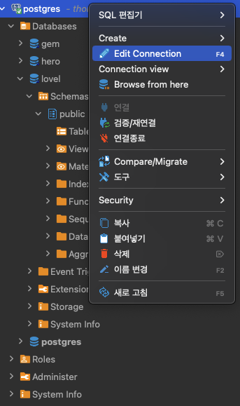 연결된 db 마우스 오른쪽 클릭->Edit Connection
