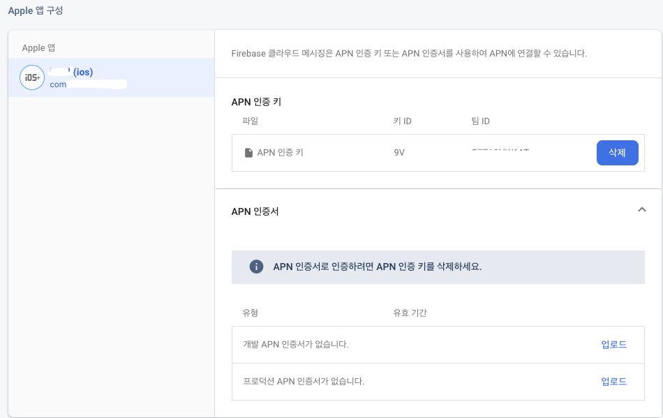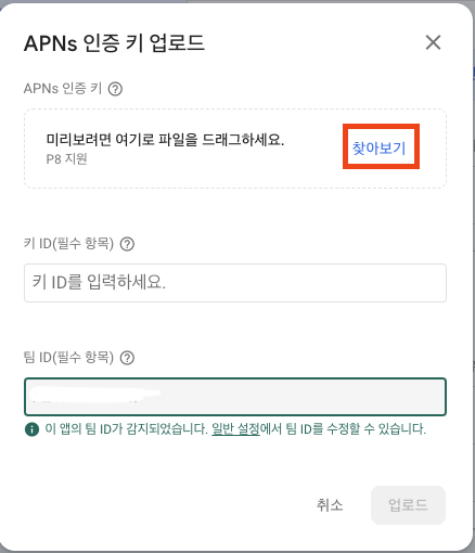 firebase프로젝트 설정 - 클라우드 메시징 - apple 앱 구성에 apn 인증서 업로드 클릭
