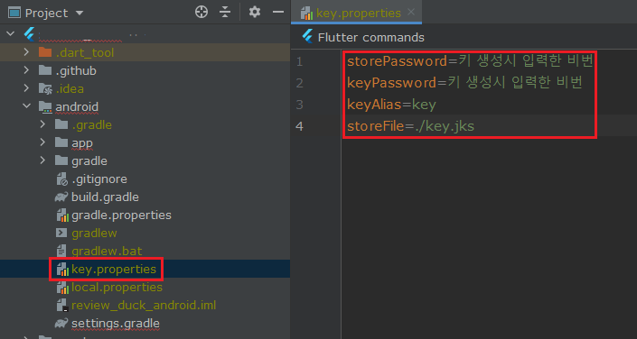 buildTypes 부분에 signingConfigs.debug 를 release로 변경 후 아래 내용 추가