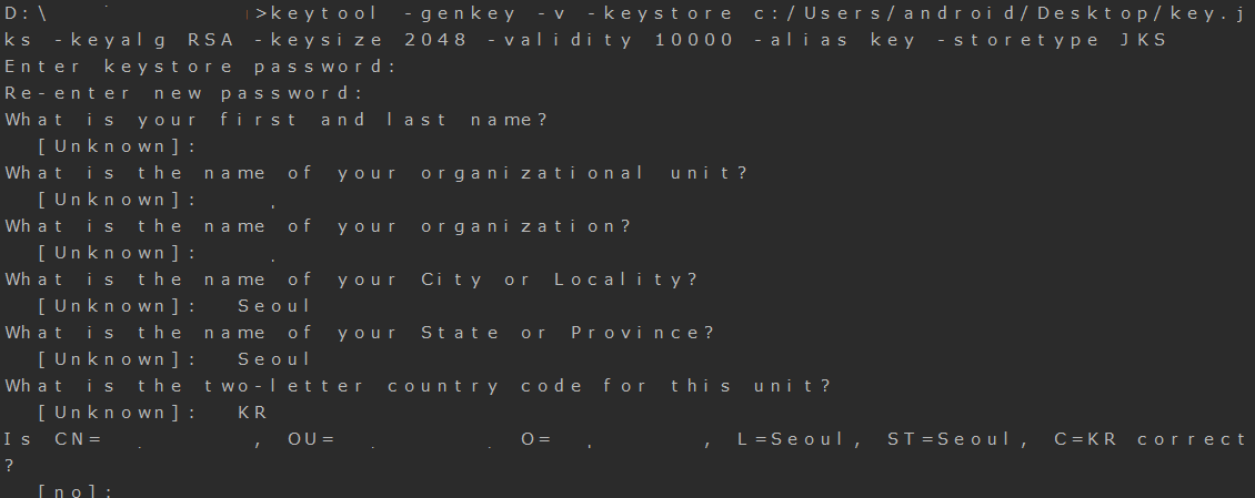 keytool -genkey -v -keystore ~/key.jks -keyalg RSA -keysize 2048 -validity 10000 -alias key