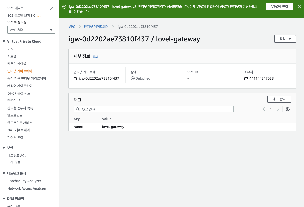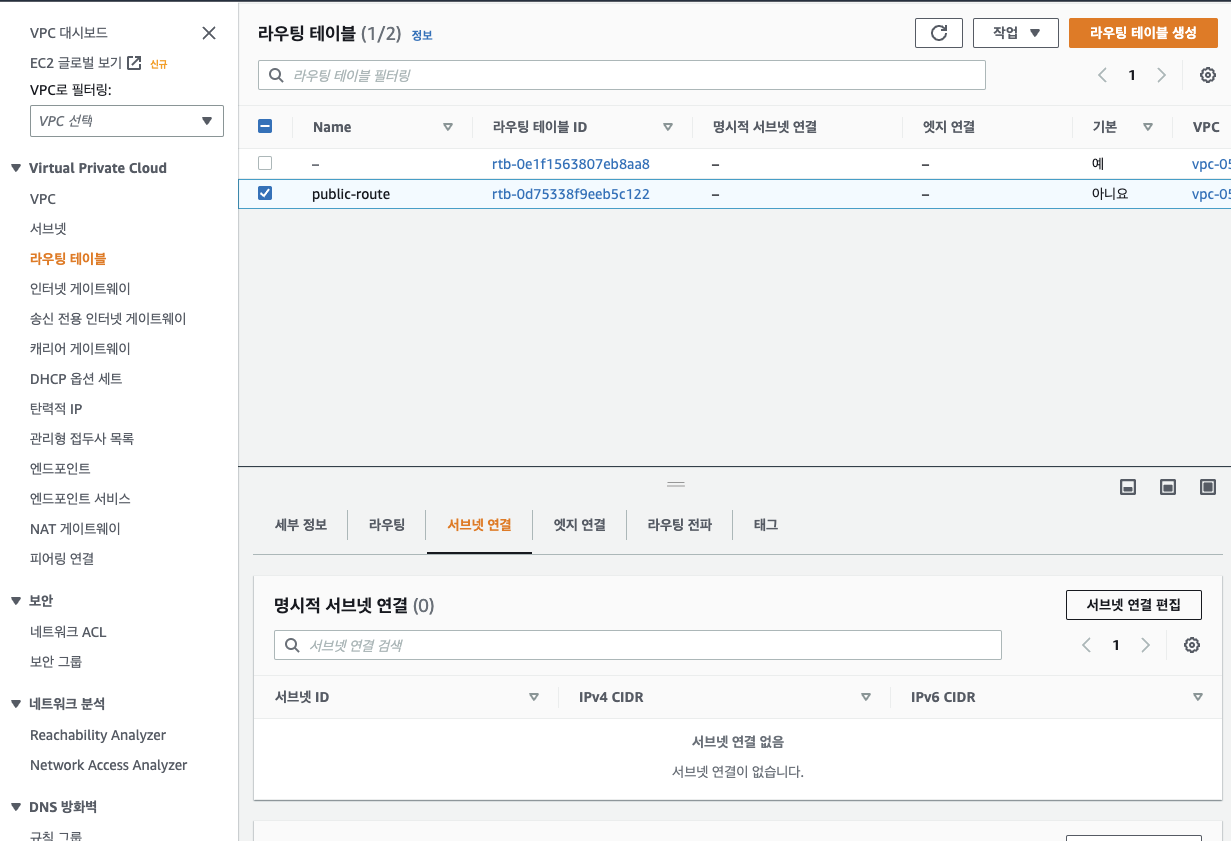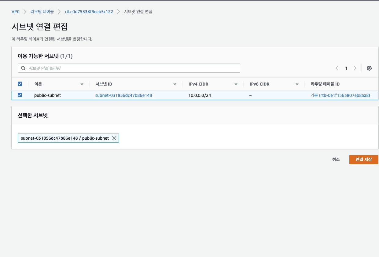 생성 후 클릭 후 서브넷 연결 클릭하여 서브넷 연결 편집 클릭