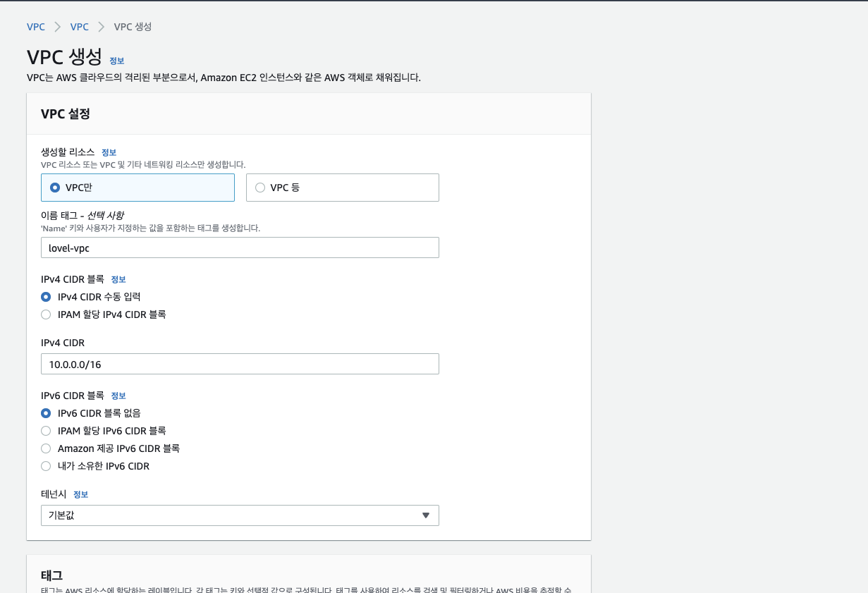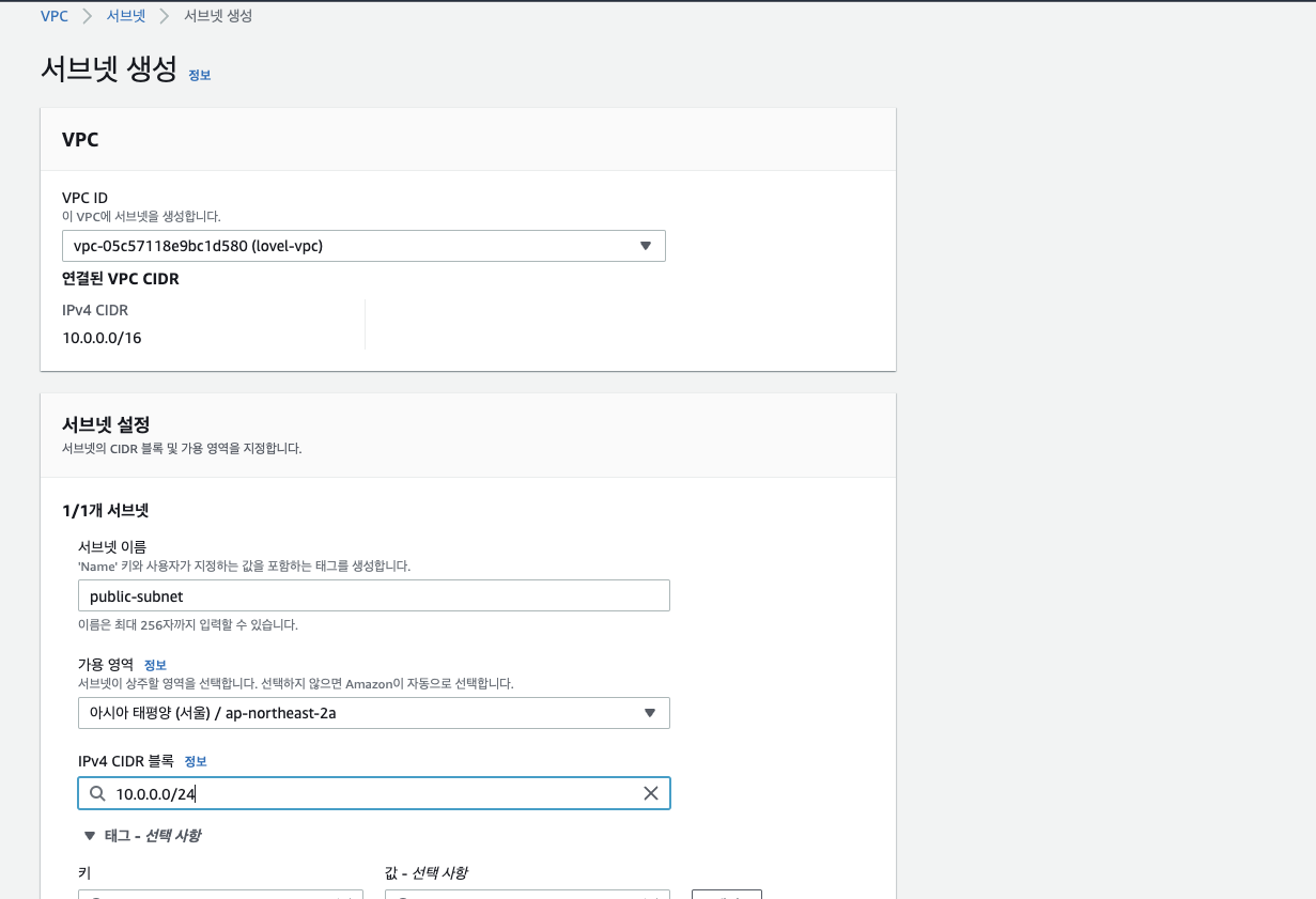 vpc id는 아까만든거 하나 있는데 클릭 , 이름과 가용영역, 10.0.0.0/24 입력 후 생성